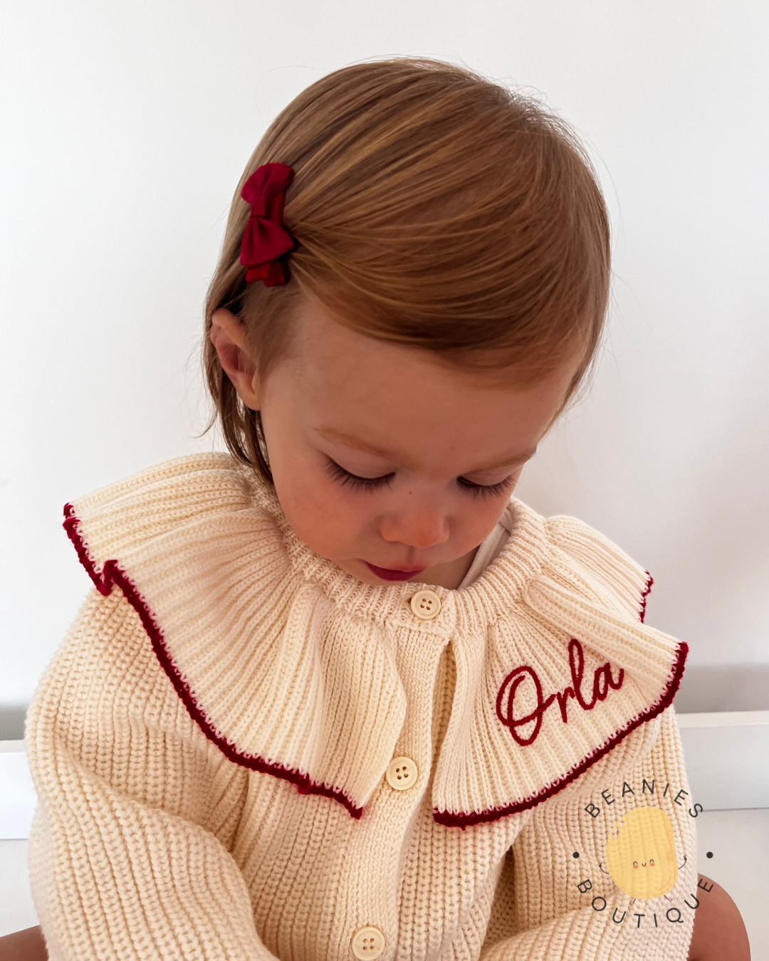 This cream cardigan is a wardrobe essential for your little one, designed with a charming embroidered frill collar. Made from beautifully soft knit fabric, it features a cosy textured finish, classic button-up front, and a statement collar edged in vibrant red for a playful pop of colour.