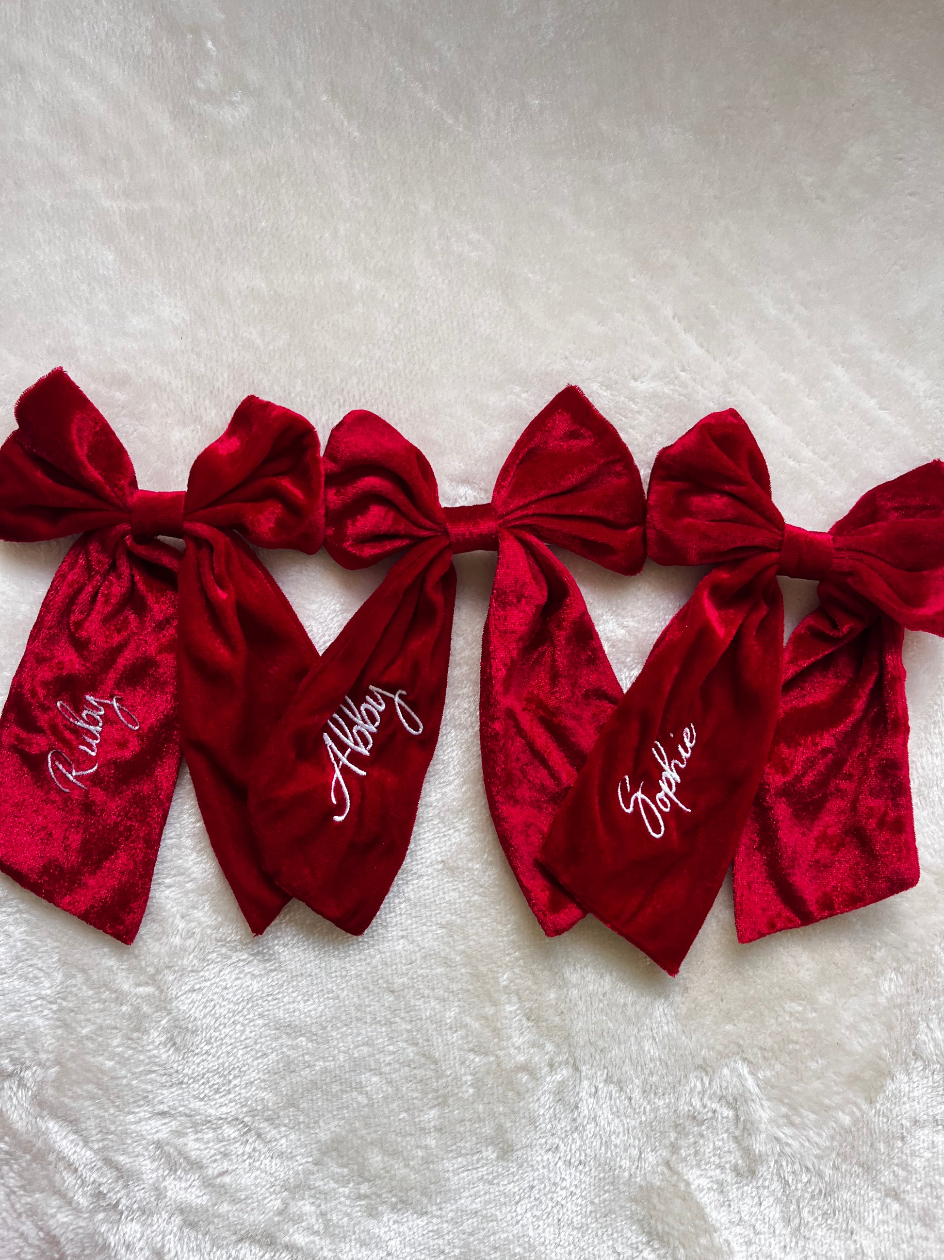 A velvet hair bow in a traditional red colour is the perfect hair accessory for Christmas and can be embroidered with any name.