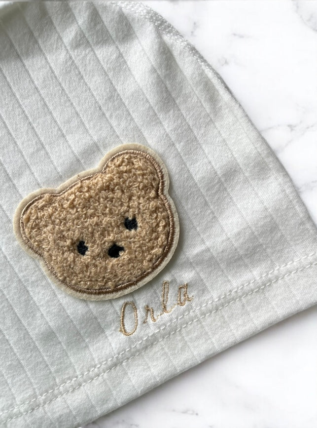Our personalised teddy bear beanie - Beautifully embroidered with your baby's name. This piece is a gorgeous must-have for your little one's wardrobe.